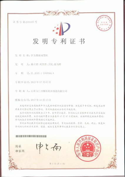 驢頭弧板成型機(jī)實(shí)用新型專利證書