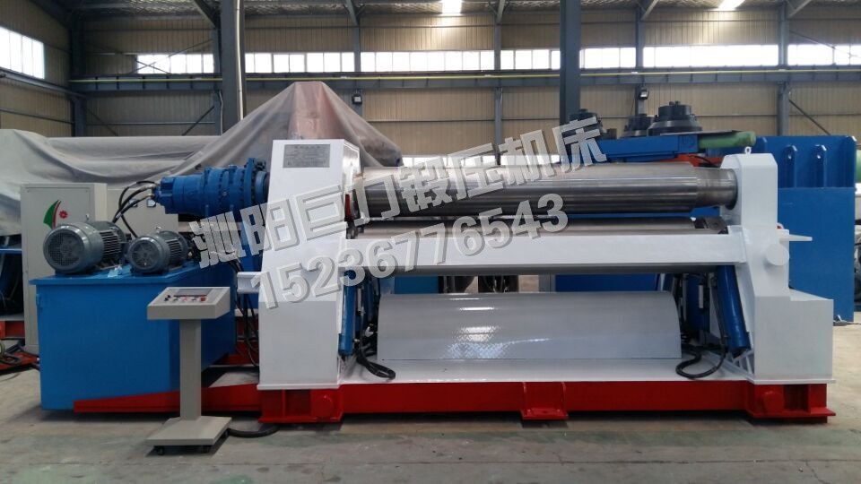 該四輥卷板機(jī)與對(duì)稱三輥卷板機(jī)比較,它可以不借助其它設(shè)備模具,直接予彎板材端部,而且剩余直邊較??;它可以不使板材調(diào)頭,而卷成工件。