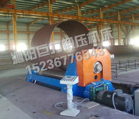 該四輥卷板機(jī)與對(duì)稱三輥卷板機(jī)比較,它可以不借助其它設(shè)備模具,直接予彎板材端部,而且剩余直邊較小;它可以不使板材調(diào)頭,而卷成工件。